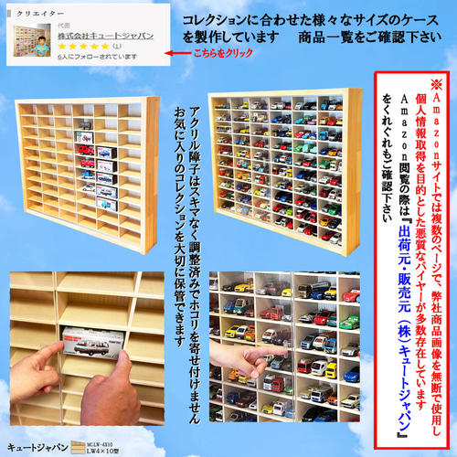 | 商品の特徴 | 180台 トミカ収納 アクリル障子付 日本製 トミカケース ミニカー。180台 トミカ収納 アクリル障子付 日本製 トミカケース ミニカー。トミカギフト収納ケース 6マス(2×3マス) アクリル障子付 日本製。【本体寸法】 巾734ミリ/高さ594ミリ/奥行113ミリ。180台 ミニカー収納ケース アクリル障子付 メープル色塗装 トミカ。【マス目寸法】 巾111ミリ/高さ50ミリ/奥行80ミリ。はるまき。アクリル障子付の収納ケース 未使用製作品です。hpi racing トミーカイラR kaira R34 GT-R 青。外枠にメルクシパイン集成材・中桟にたわみの無い5.5ミリ厚のラワンベニヤ(中桟正面は塗装仕上)を使用しています。スーパートレジャーハント '49 Ford F1 ホットウィール。ケース本体は、手触りのやさしい超仕上げ・面取り加工を施しています。【新品未使用】トミカくじ。天然素材の木の香り、ぬくもりを感じられます。値引き★木製ミニカーケース 128台・大型サイズ収納 アクリル付 マホガニ色塗装。ミニカーが1マスに3台、最大180台収納できます。★値引き★マホガニ色全塗装 ロングトミカ コレクションケース アクリル障子付。アクリル障子は透明度が高く、大切なコレクションをホコリや傷から守ります。トミカ 人気車アリ 廃盤 未開封 希少 まとめ売り 12台セット。大事に保管したい皆さまにご満足いただける一品と自負しております。トミカ プラキッズ ファミリーカー takara tomy 新品 未開封 廃盤。コレクター様に『こんなの欲しかった!』 そう言わせたい一心で製作しました。トミカ ディスプレイケース ジャンク品。アクリル障子付ケースは3割を超える方がリピート(感謝!)されています。東京ディズニーリゾート トミカ4台セット プーさん、イーヨー 他。ありがとうございます。Hotwheel Ferrari 641/F190 ミニカー #1 Winner。お片付けが苦手なお子様にも楽しみながら整理上手に・・。イグニッションモデル 1/18 jzx100チェイサー。プレゼントにもおすすめです。【12個】ホットウィール マッチボックス ミニカー まとめ売り ①。ミニカーは付属していません、ケース本体のみの販売です。1/18 オートアート Ford GT 2004 訳あり。購入時の注意点:材料は建材を使用していますが、表面は天然木のため色目・木目・節の具合がその都度変わります。'70 Chevyシボレー Montecarloモンテカルロ 1/18 ワイスピ。天然単板独特の節目・木目の濃淡・接ぎ目が目立つ場合がありますが、構造上問題はありません。京商 LEXUS IS500 \"F SPORT Performance\"。製作では裏面の意匠は視覚的に重要視していません。ホットウィール1976 フォルクスワーゲン・ゴルフ MK1 GTI。ご了承ください。カーズ マテル ミニレーサーズ ミニミニカーズ。●スライド式障子は光線透過率93%の高品質アクリル板3ミリ厚を使用しています。DUCATI パニガーレV4 SP2 1/6スケール ドゥカティ。引手加工をほどこしていますので開け閉め楽々です。1/18 GT091 BENT. T2 BLUE ミニカー。●外枠に木目を活かしたパイン集成材を使用しています。トミカリミテッドヴィンテージネオ トヨタ クラウン バンデラックス グリーン。長年お使いいただけるよう頑丈な造りとなっています。ロードスターCAR GRAPHIC40周年ミニカー 6個クラブイベントの景品に。。 ※中桟は固定式で可動はしません。トミカリミテッド 10箱(14台)まとめ TOMICA LIMITED。サイズをご確認のうえご購入ください。トミカリミテッド ミニカー17台セット まとめ売り。●本商品は、(株)キュートジャパンにより日本国内で製作・販売を一貫して行っています。高級ダイキャストミニカー リミテッドエディション。ご購入された方の『コレ、また欲しい!』の嬉しいご感想を励み(ビタミン剤です!)にして、日々製作を行っております。OTTO 1/18 BMW E34 M5 ブルー (限定品)。製作・販売元 株式会社キュートジャパン#トミカ#ホットウィール#京商#トミカリミテッド#コレクション#ディスプレイ#トミカケース#ミニカーケース#トミカ収納#ミニカー収納#プレゼント#ショーケース | ||